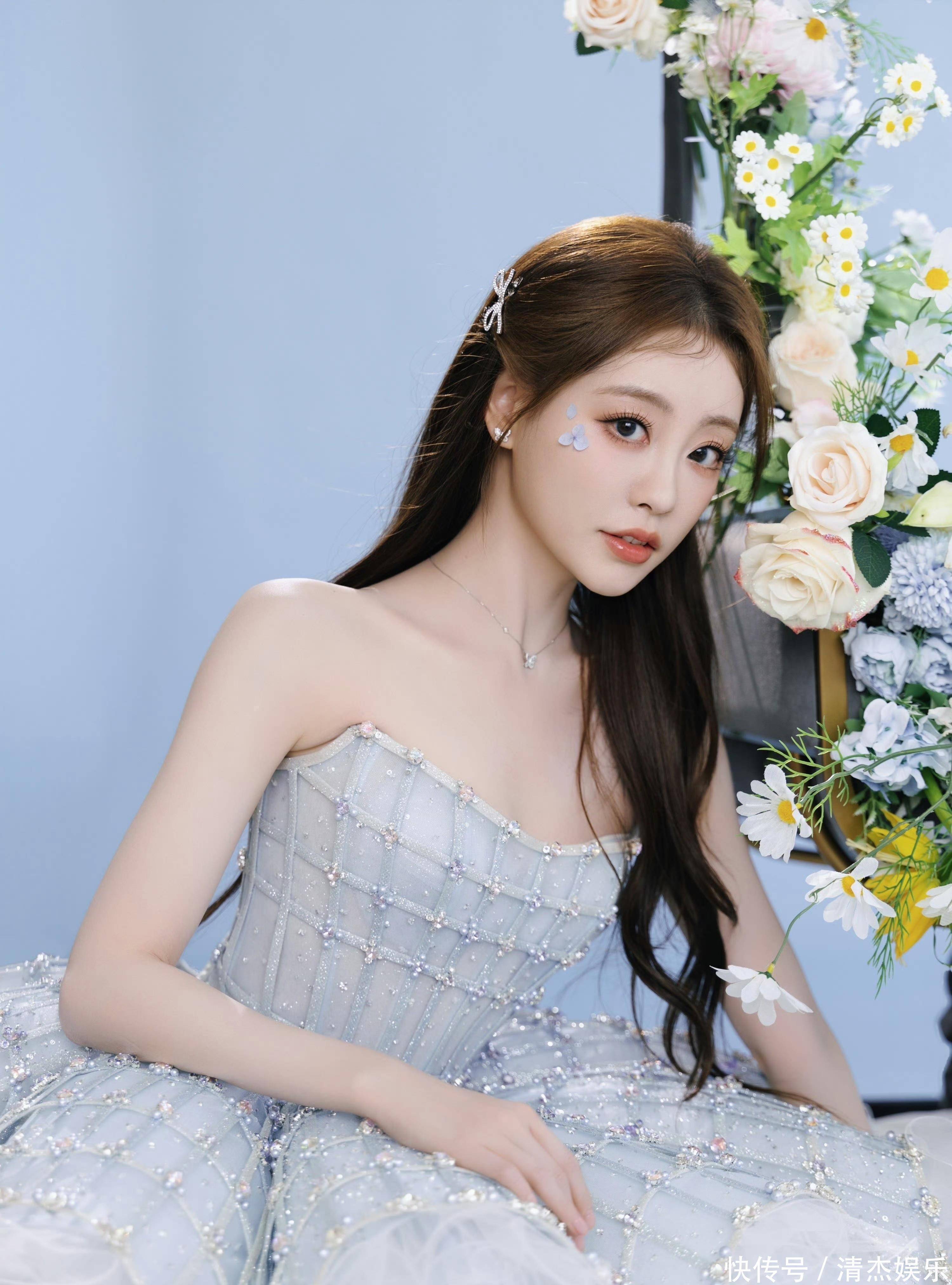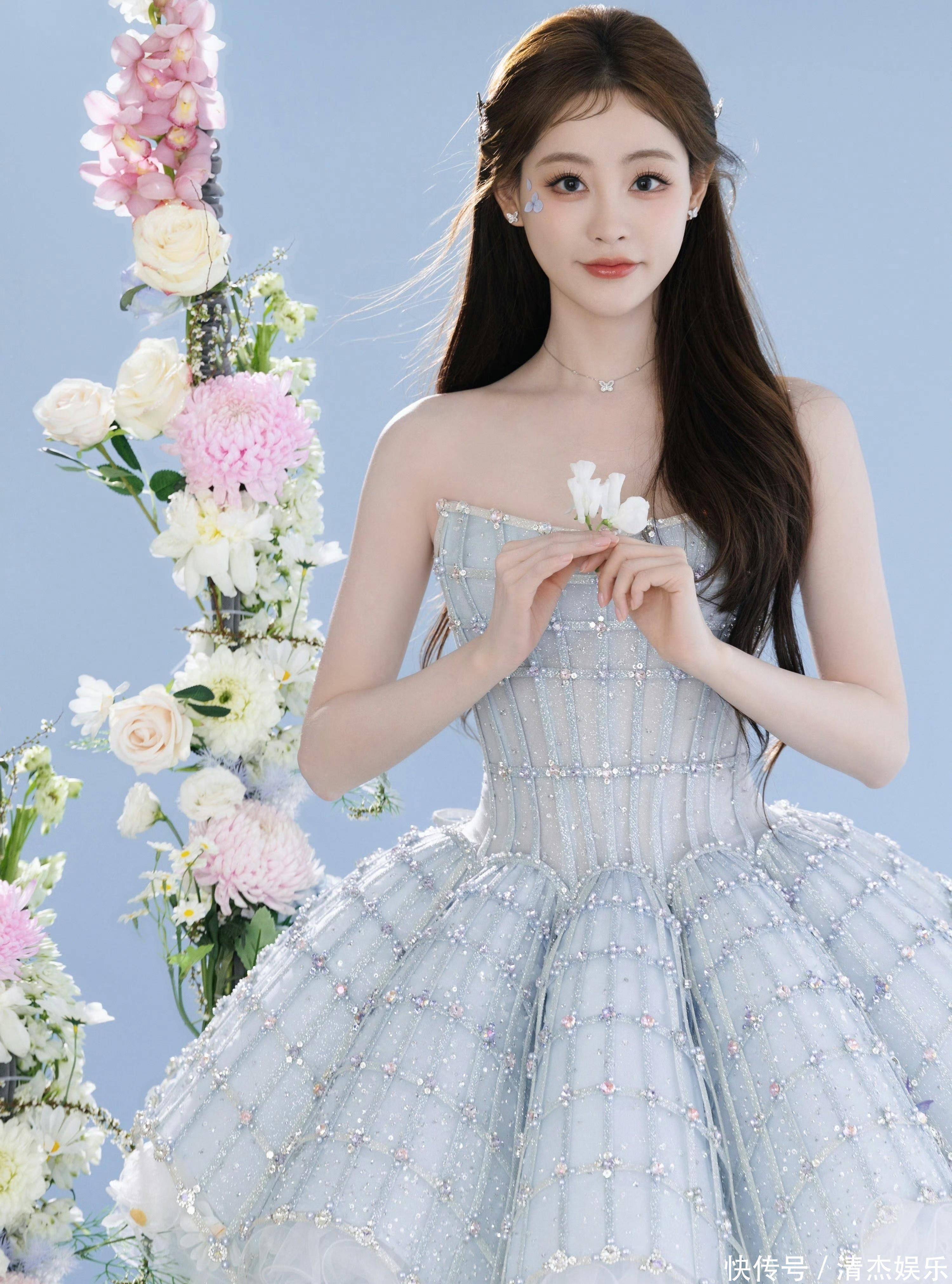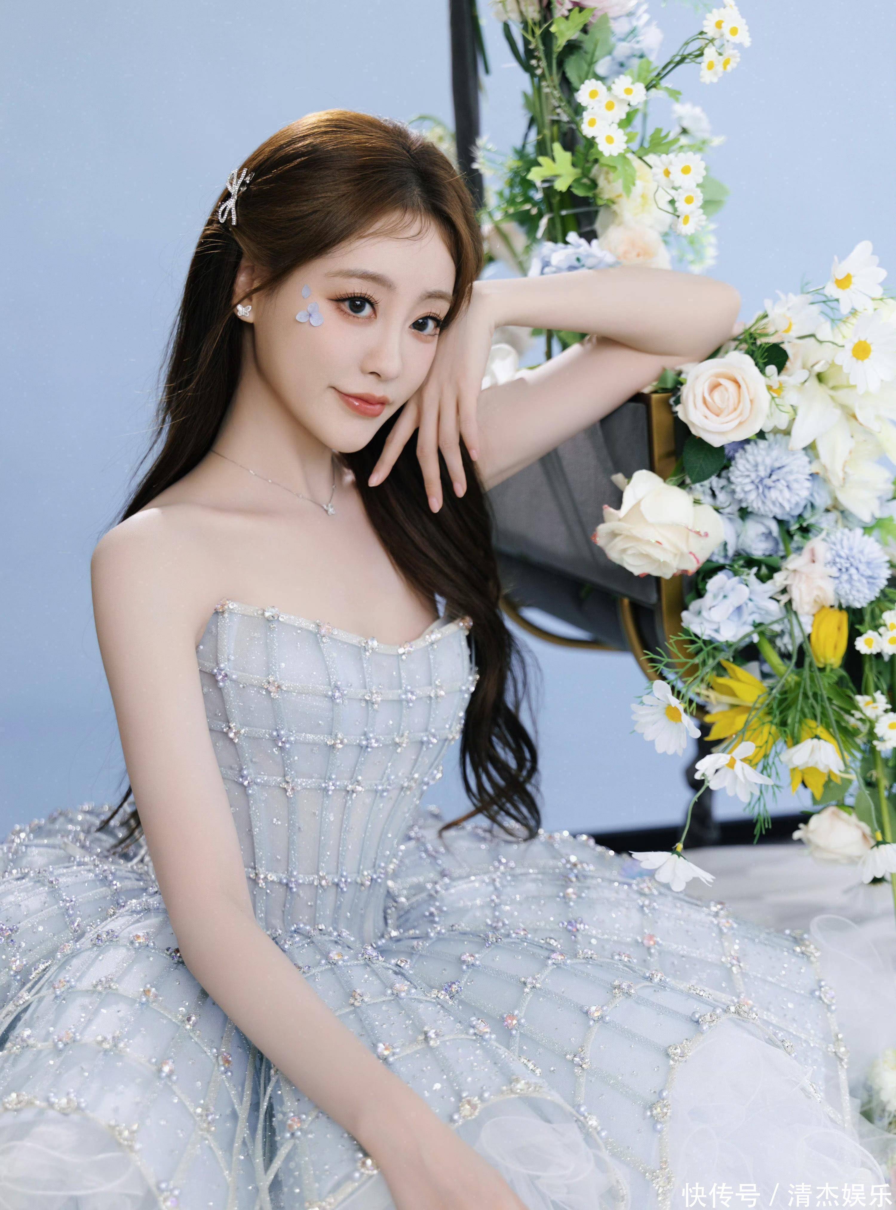 当祝绪丹身着一袭淡蓝色钉钻纱裙出镜,瞬间将梦幻与优雅揉成了独属于她的魅力。浅蓝纱裙上缀满细碎的钻饰,在光影下闪着朦胧的光,抹胸设计勾勒出纤细的肩颈线条,蓬松的裙摆层层叠叠如云朵般轻盈,搭配精致的碎钻妆容,她宛如从童话里走出的冰雪公主,一抬手一投足都透着灵动的仙气。